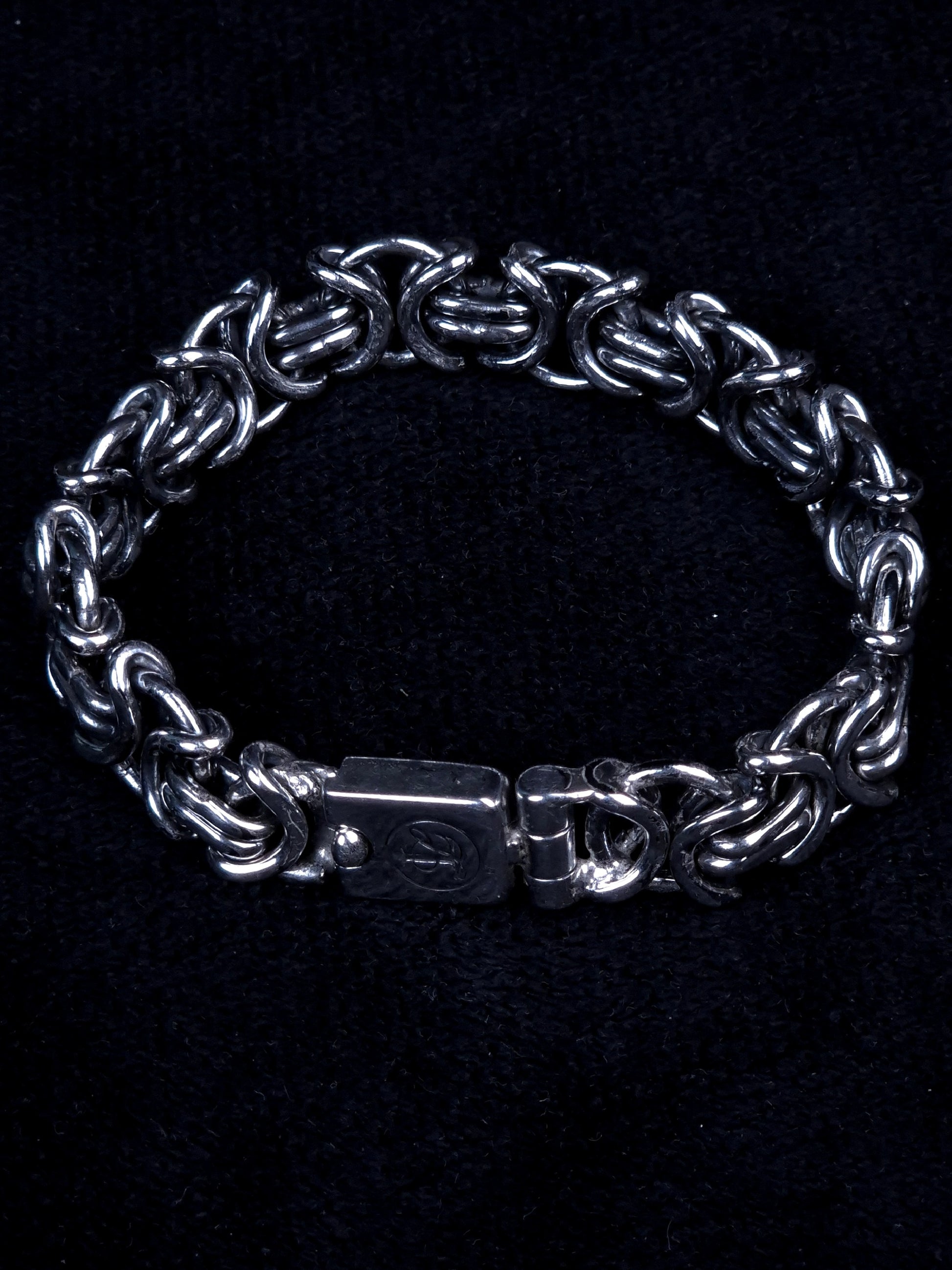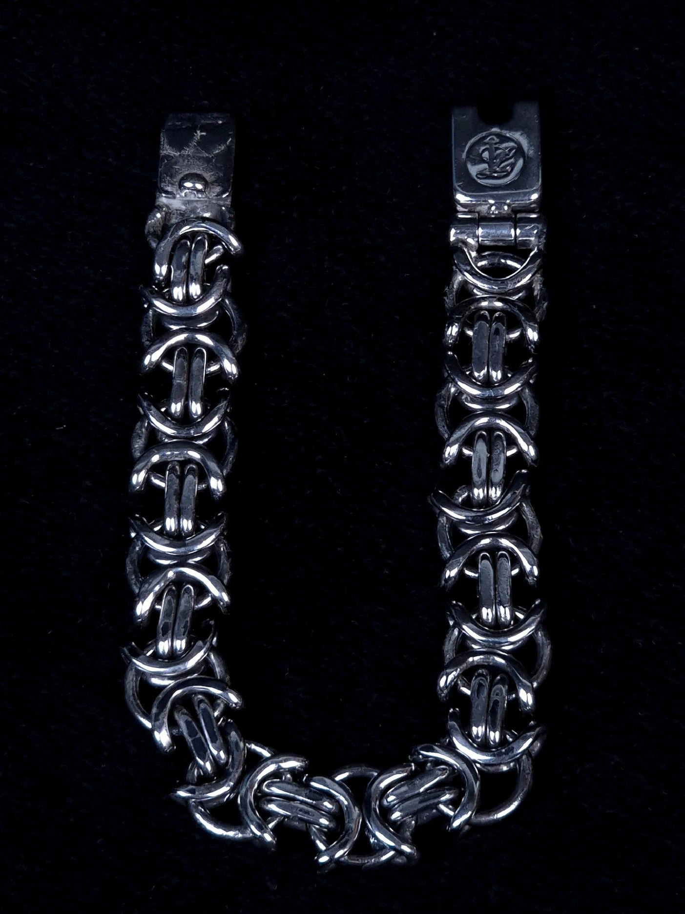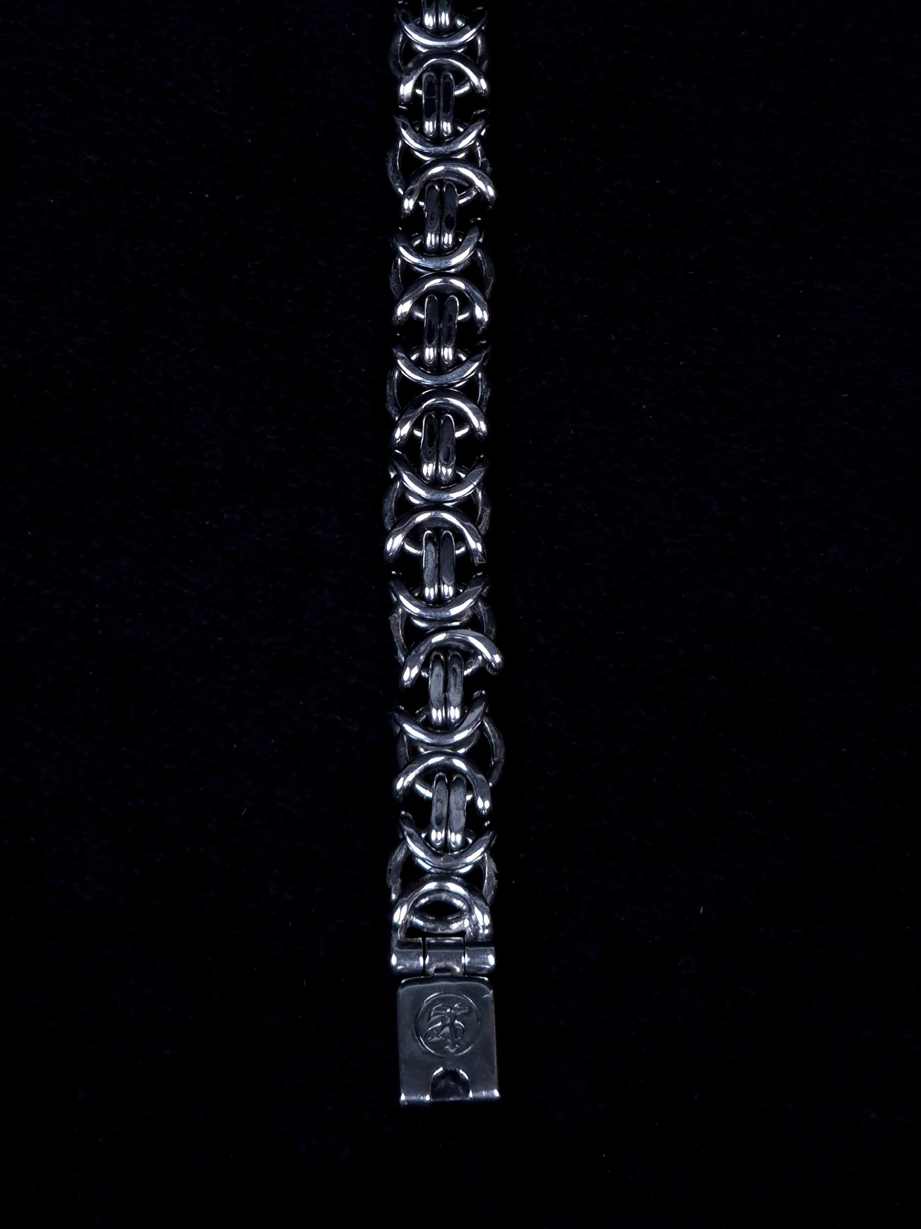 Flat Byzantine-armbandet är känt för sin komplexa, sammanlänkade struktur som skapar en slät och flexibel yta. Denna version har noggrant plattats och oxiderats för att framhäva mönstrets djup och skapa en slående kontrast som förstärker dess djärva, polerade uttryck. Armbandet sitter bekvämt runt handleden och utstrålar tidlös maskulin närvaro. Med ett säkert specialtillverkat kassalås kombinerar det både hållbarhet och stilren finish.