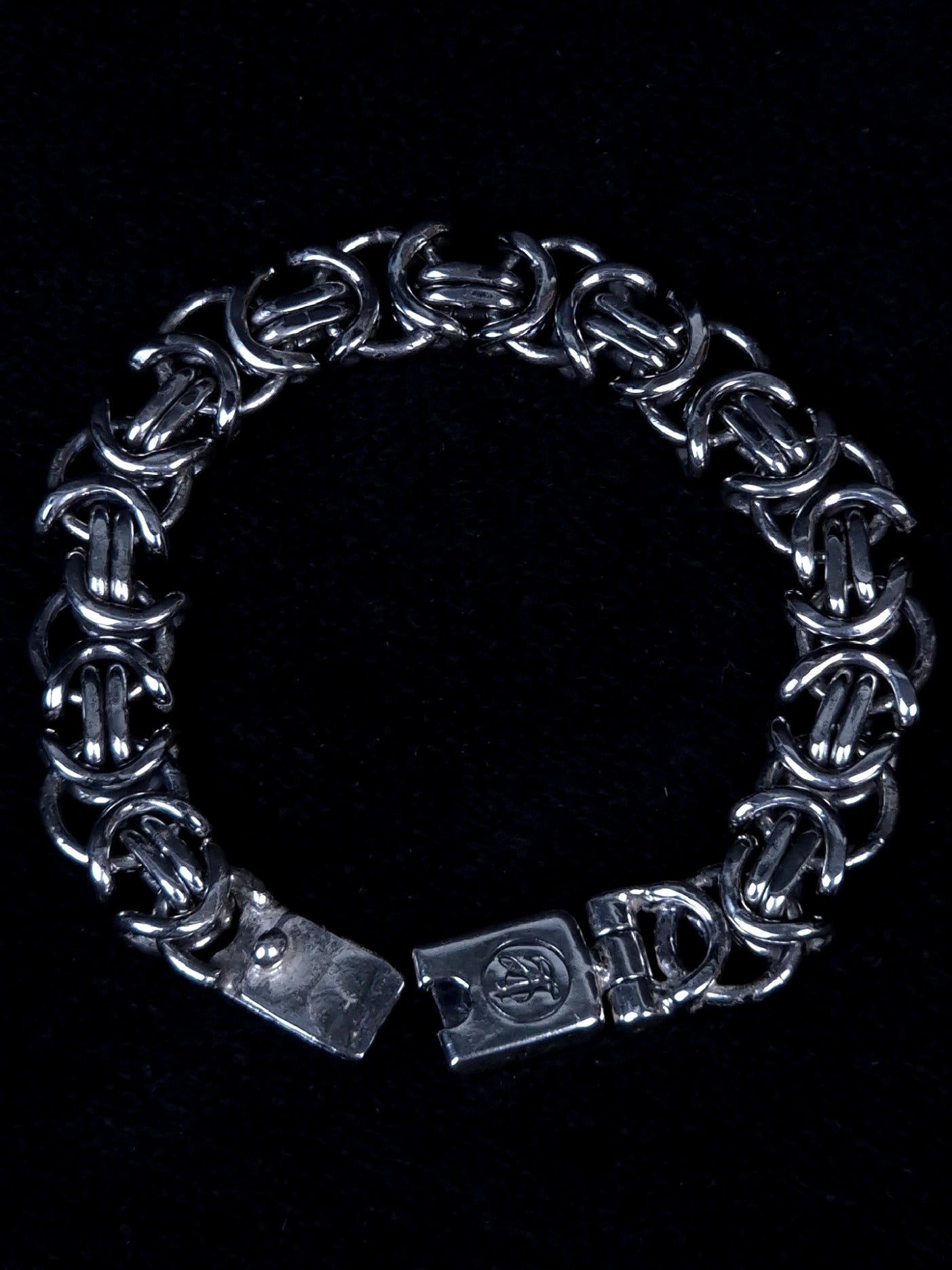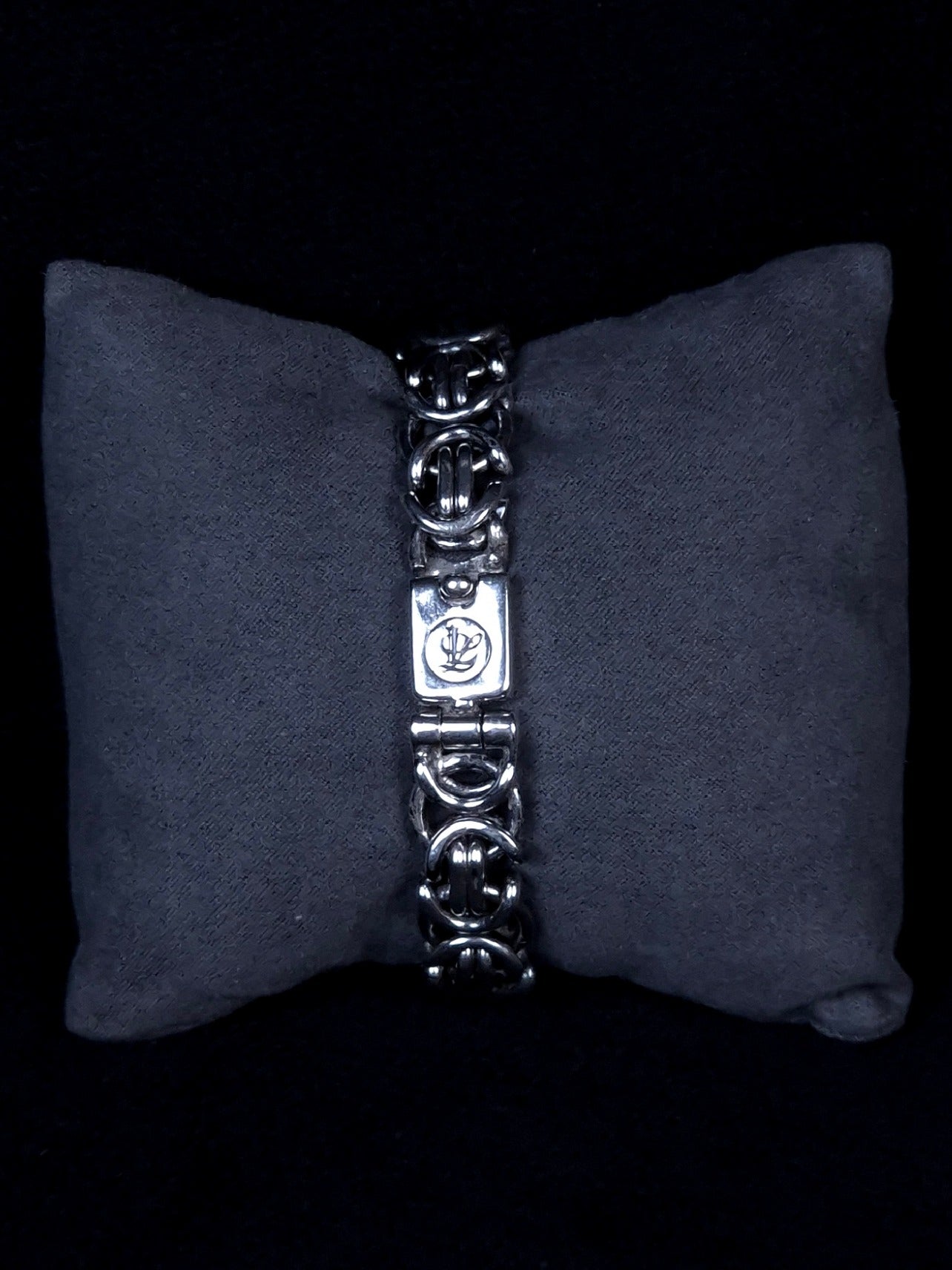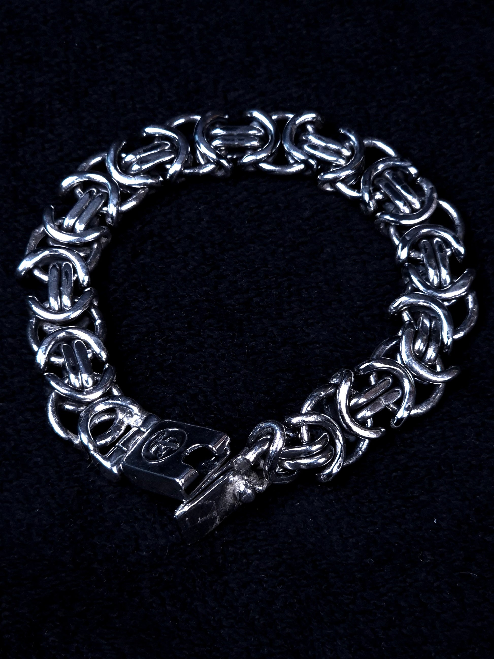 Flat Byzantine-armbandet är känt för sin komplexa, sammanlänkade struktur som skapar en slät och flexibel yta. Denna version har noggrant plattats och oxiderats för att framhäva mönstrets djup och skapa en slående kontrast som förstärker dess djärva, polerade uttryck. Armbandet sitter bekvämt runt handleden och utstrålar tidlös maskulin närvaro. Med ett säkert specialtillverkat kassalås kombinerar det både hållbarhet och stilren finish.